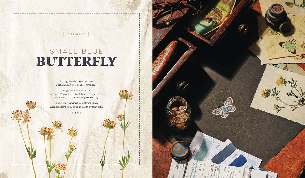 In Volume 1, winter and spring are showcased in eight vignettes of local wildlife from a badger, lumbering through frosty undergrowth, a fox pausing beside a misty meadow, sparrows singing in the hedgerows to a moth spreading its delicately ornamented wings in the warm air.