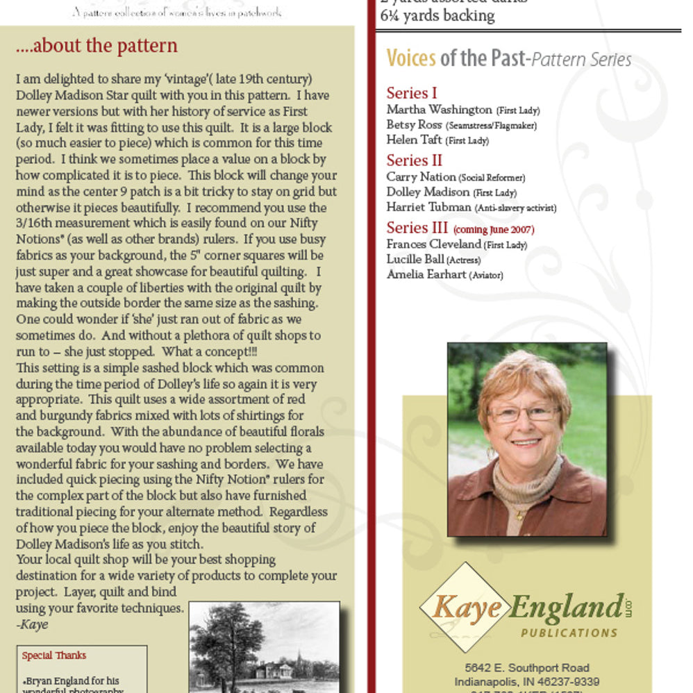 This 6 page full color tri-fold booklet is part of a continuing series celebrating women's lives in patchwork from Kaye England Publications.