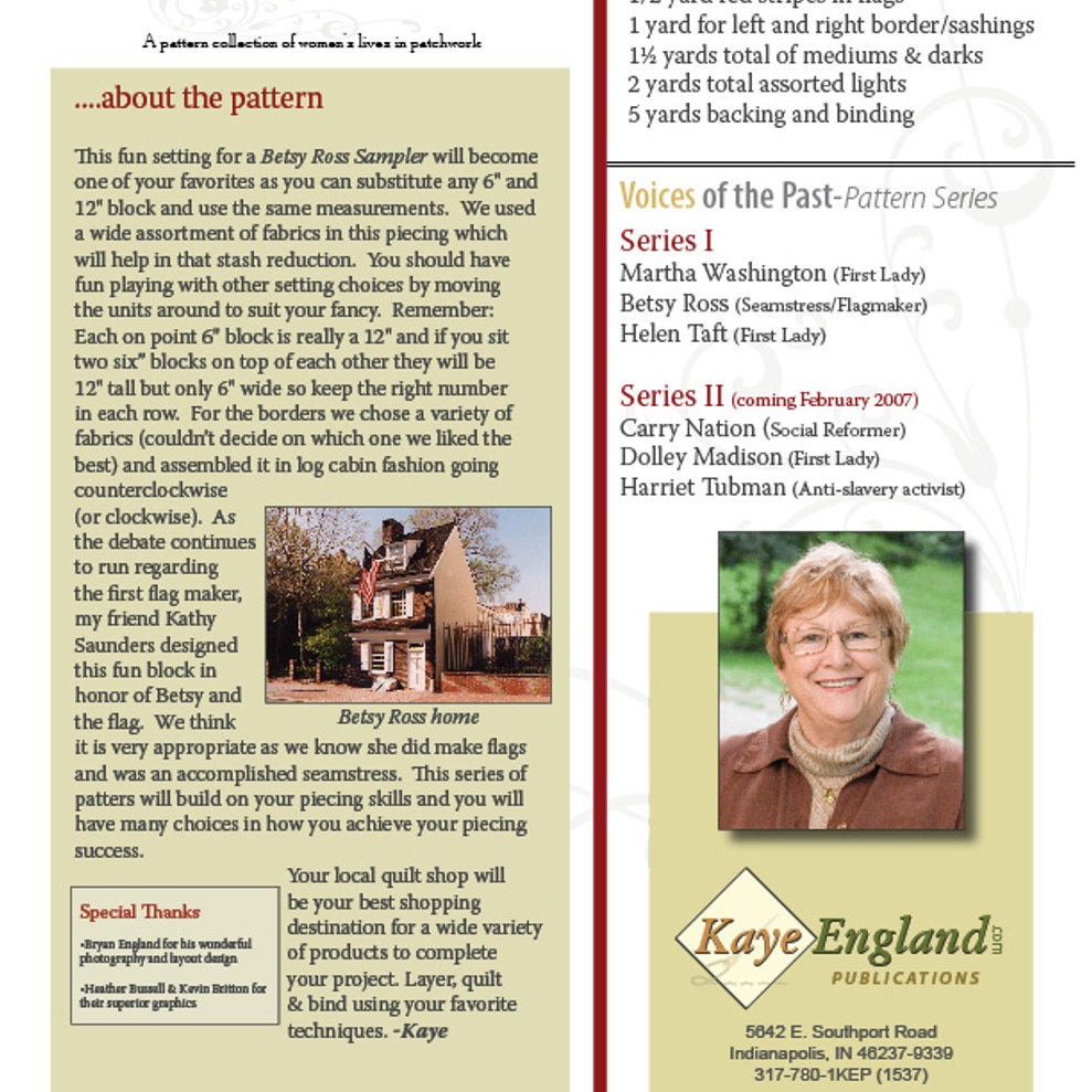 This 6 page full color tri-fold booklet is part of a continuing series celebrating women's lives in patchwork from Kaye England Publications.