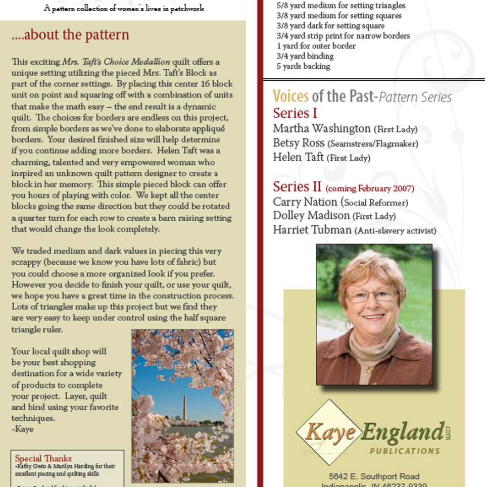 This 6 page full color tri-fold booklet is part of a continuing series celebrating women's lives in patchwork from Kaye England Publications.